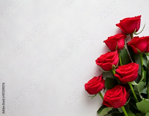 Red rose flower stem bunch flat lay top view on neutral white clean