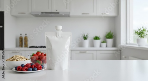 Reusable food pouch mockup in a modern kitchen setting, surrounded by oats, berries, and healthy ingredients, perfect for branding or packaging.