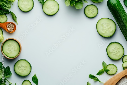 Rodajas de pepino con especias y hierbas en disposición circular sobre un fondo claro. Ideal para recetas saludables.