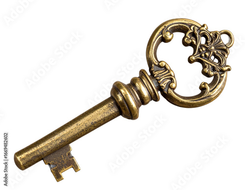 Rustic Brass Key with Decorative Handle, Angled Side Perspective, Transparent Background PNG