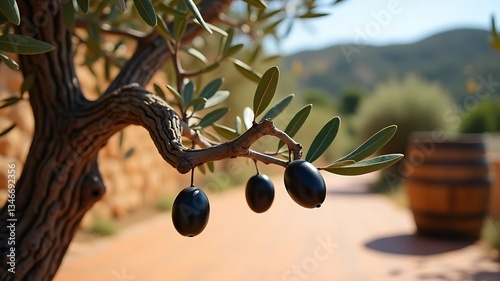 Rustic Olive Branch with Ripe Black Olives and Sunlit Leaves in a Mediterranean Landscape
