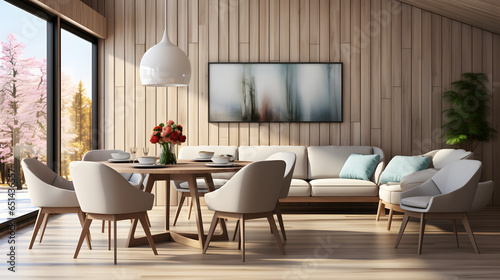 Rustic round table and beige fabric chairs in spacious room with paneling wall. Scandinavian interior design of modern living room