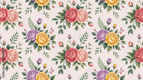 Seamless floral pattern with pink, yellow, and purple roses on soft pink background – elegant botanical design for fabric and wallpaper