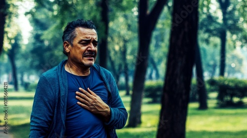 senior man felt severe pain in the heart area while walking and doing sports, standing in the park and holding his chest with his hands