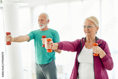 senior stretching exercise woman training lifestyle sport fitness home healthy gym exercising fit man couplerehabiliotation physiotherapy recovery clinic dumbbel lifting weigth