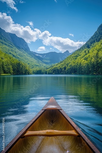 ** Serene Canoe Ride on a Tranquil Mountain Lake Surrounded by Lush Green Forests and Majestic Peaks Under a Clear Blue Sky..**