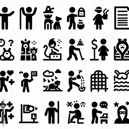 series of simple black-and-white clipart figures arranged in two rows, each with four distinct categories.