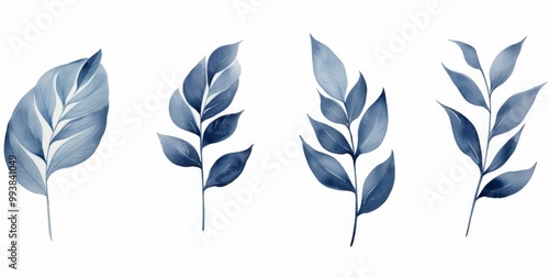 Set of 3-piece watercolor botanical leaf wall art in indigo blue on a white background.