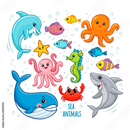 set of funny cartoon animals. Cute ocean fishes, octopus, shark, dolphin, crab and whale. underwater animals.