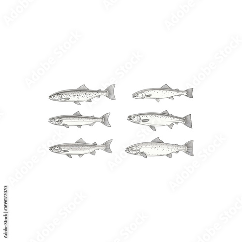 Set of salmon silhouette in line art style fish collection seafood illustration aquatic animal drawing decorative design isolated on white background