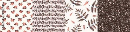 Set of seamless nature pattern. Abstract shapes and elements, leaves, plants, palm, summer, white and brown background, hand drawn, minimalist, packaging, wallpaper, design for textiles, vector