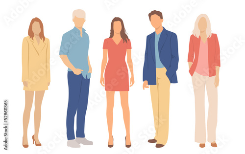 Set of young men and women, different colors, cartoon character, group of silhouettes of standing business people, students, the design concept of flat icon, isolated on white background
