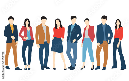 Set of young men and women, different colors, cartoon character, group of silhouettes of standing business people, students, the design concept of flat icon, isolated on white background