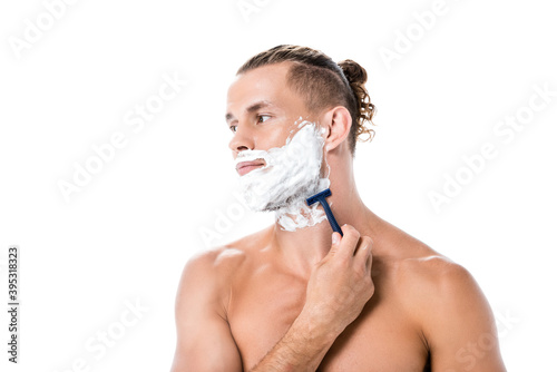 shirtless man with foam on face shaving isolated on white