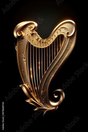 Simple logo design featuring a gold harp with strings, black background, gray for the harp texture and white, minimalist