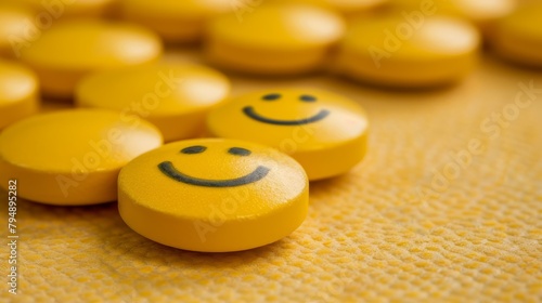 six yellow smileys sit atop, their expressions mirrored by candies beneath - each circular candy bears a drawn-