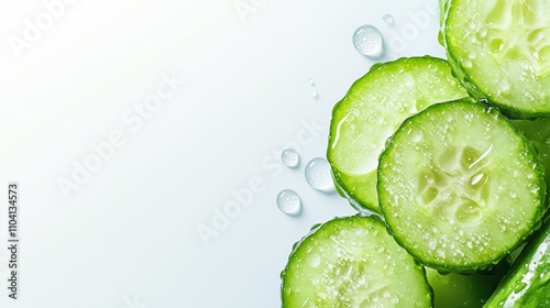 sliced cucumbers with water droplets on them, set against a white background The cucumbers are a vibrant green color, and the water drops glisten in the light, cre