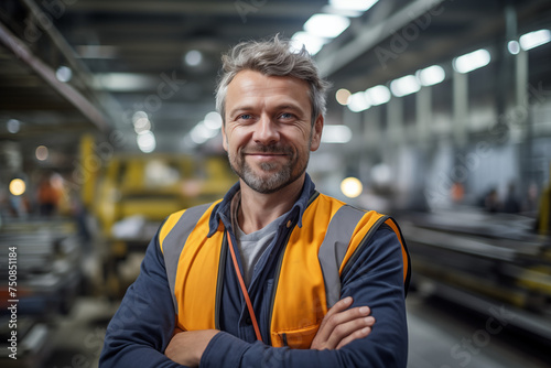 Smiling european man at work in a factory. Worker recruitment. Job offer. Work in industry. Jobs in a factory. Factory in Europe.