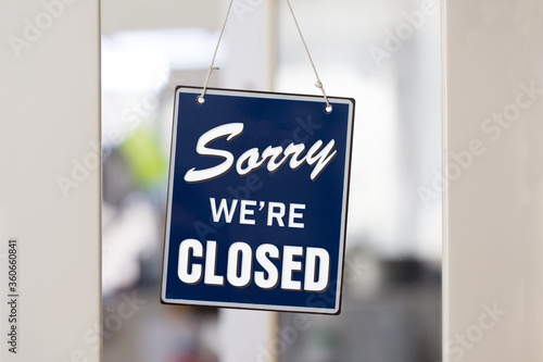 " Sorry we're closed " sign in blue and white, on shop glass door with white panels.