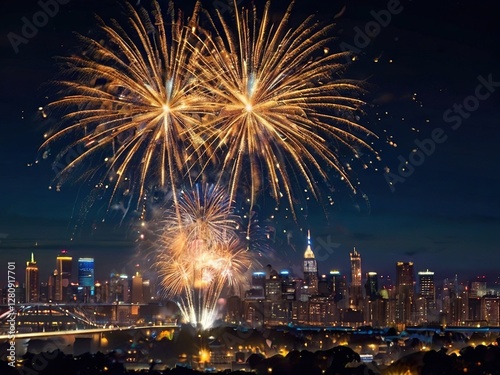 Spectacular Fireworks Display Over City Skyline at Night