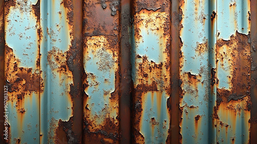 steel wall featuring a rusty orange and blue texture, with intricate patterns suggesting age and decay, evoking a sense of industrial history and weathered beauty