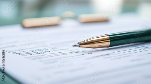Tax planning deduction concept. A close-up of a green pen resting on a document, highlighting the importance of writing and paperwork in a professional setting.