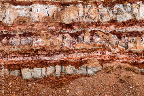 texture of different layers of clay underground in clay quarry after geological study of soil.