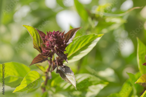 Thai basil plant. Organic herb. Purple flower. Shallow depth of field, selective focus.
