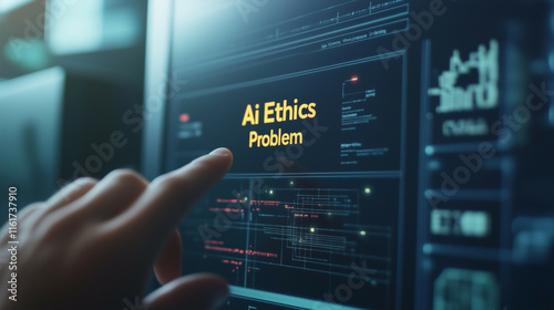 The scene shows a clean, modern screen with the large word Ai Ethics Problem on the screen with yellow color accent and capital letters and there is minimalist network image below it