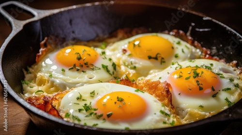 three fried eggs in a frying pan with parsley on the top of the frying pan and on the bottom of the frying pan. generative ai