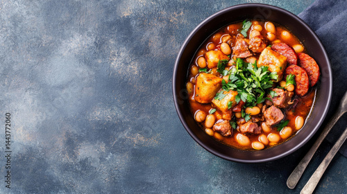 Traditional Portuguese feijoada with beans and meat in a bowl o