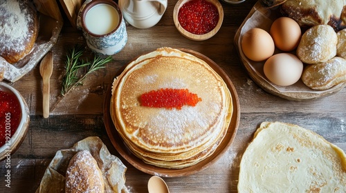 Traditional Russian pancakes with red caviar and fresh ingredients on a rustic table