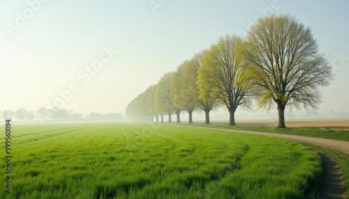 Tranquil country road lined with tall trees and lush green fields