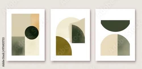 Trio of Abstract Posters Featuring Geometric Shapes in Olive Green and Beige Tones – Circles, Ovals, and Squares on White Background