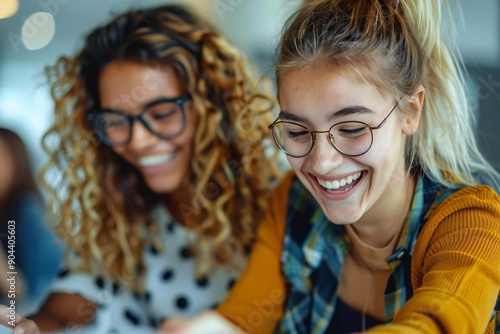 - Two beautiful young businesswomen smiling and laughing while doing calculations in the office, one wearing eyeglasses, both looking down at a financial document.