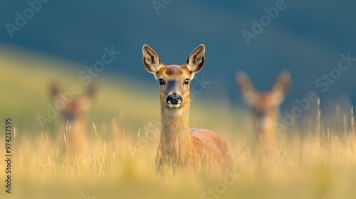 Two deer stationed side by side in a towering grass field beneath a blue sky