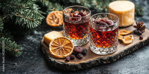 Two glasses of warm, spiced drink with dried fruit and cheese on a wooden board, with pine needles. Ideal for holiday food blogs, recipe sites, and festive social media posts.
