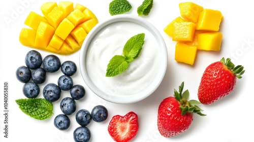 Una mezcla de fresas, arándanos, mango y hojas de menta alrededor de un bol de yogur natural, creando un contraste fresco y colorido.