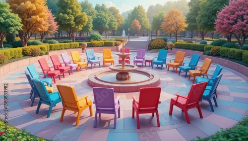 Vibrant Vectors Empty Seats in a Retro Park with a Pixelated Fountain