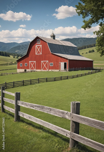 Vintage red barn with a weathered wooden fence in a rural landscape with rolling hills.