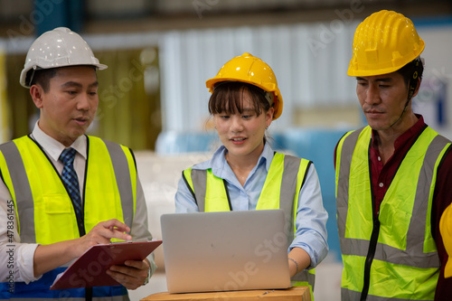 Warehouse worker meeting. Employee asian people using laptop in factory