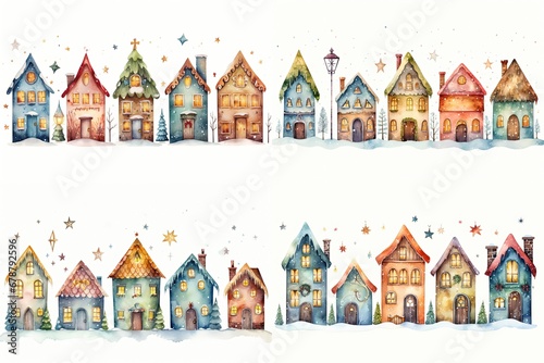watercolor cartoon style illustration, cute house in winter time, decorated in happy Christmas and new year theme, Generative Ai