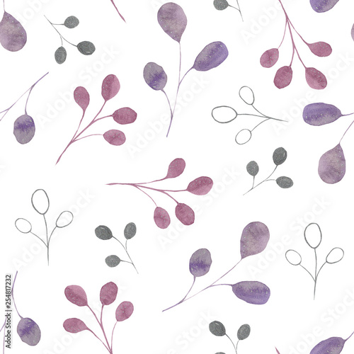 Watercolor pattern with silver, green, purple, violet leaves and branches on a white background. Ideal for cards and invitations.