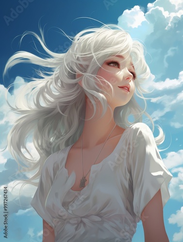 white-haired girl with long hair gently floating in the wind stands among clouds, against a light blue sky background