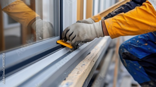 window repairman adjusting a large window frame, using a level to ensure proper alignment.