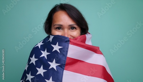 woman wrapped in the flag of the US flag