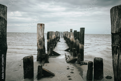 wooden pillars in the sea. Old wooden pier on a cloudy day.sea photo wallpaper. Low tide time.Germany. North Sea.