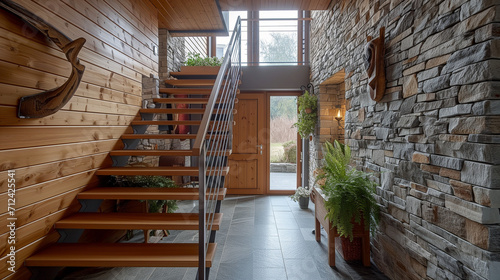 Wooden staircase and stone cladding wall in rustic hallway. Cozy home interior design of modern entrance hall with door