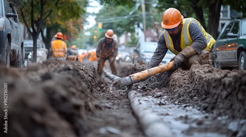 Worker in muddy trench repairing underground pipeline, focusing on maintaining city’s essential infrastructure under challenging conditions.
