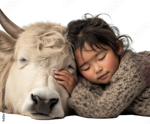 Young Asian Girl Resting Peacefully Against A Yak: A Tender Moment Of Warmth And Bonding In A Cold Rural Landscape, Capturing The Deep Connection Between Humans And Nature In A Serene Setting